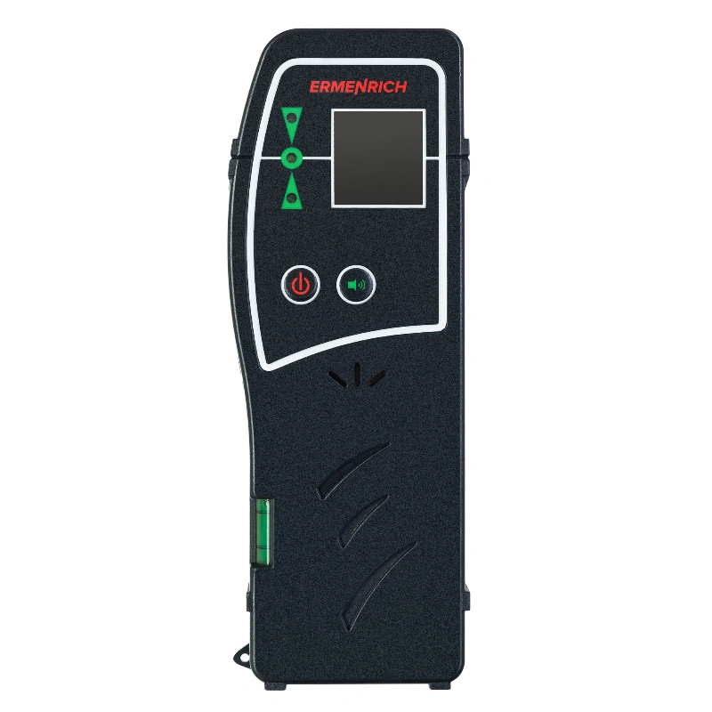 Ermenrich LR30 -это удобный лазерный приемник, который помогает работать с лазерным уровнем там, где сам луч видно плохо: на большой дистанции, в ярком свете или в условиях, когда глазом его не различить. Прибор фиксирует положение луча на расстоянии до 50 метров и работает как с зелёными, так и с красными лазерами. На корпусе расположены световые индикаторы и два пузырьковых уровня, которые помогают быстро выставить устройство в нужное положение. При необходимости приемник можно закрепить на штативе -в корпус встроен разъём 1/4", а также в комплект входит удобный кронштейн.