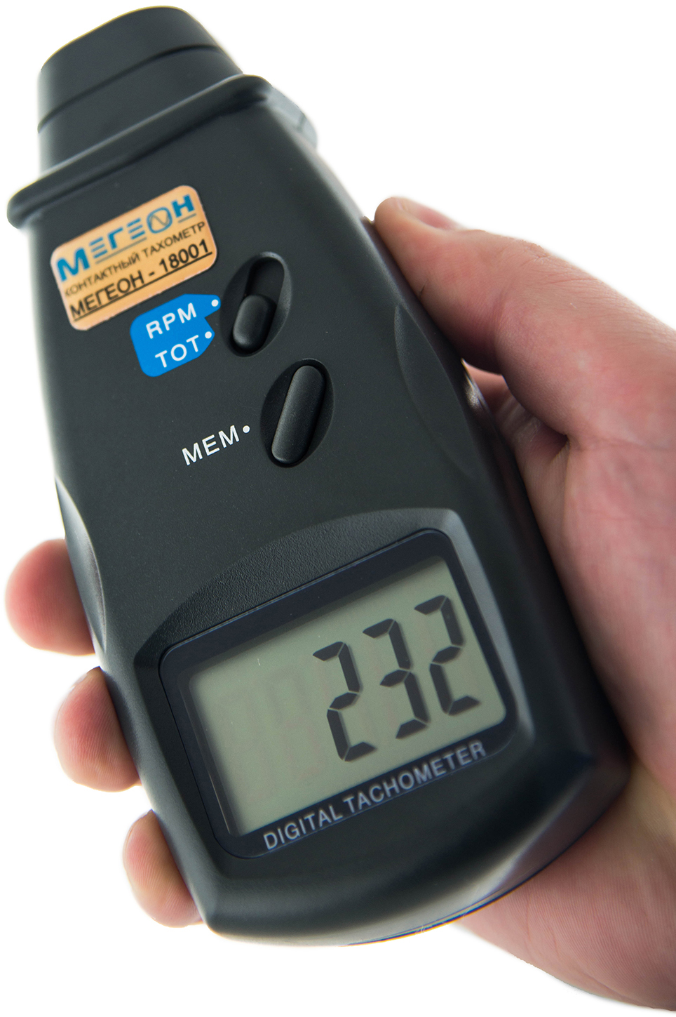 Портативный цифровой тахометр способен измерять скорость вращения в диапазоне оборотов от 2,5 до 99999 об/мин на расстоянии 5 ... 50 см. Прибор оснащен функцией определять минимальные, средние и максимальные показатели измерений, которые автоматически сохраняются в память ёмкостью 96 ячеек.
